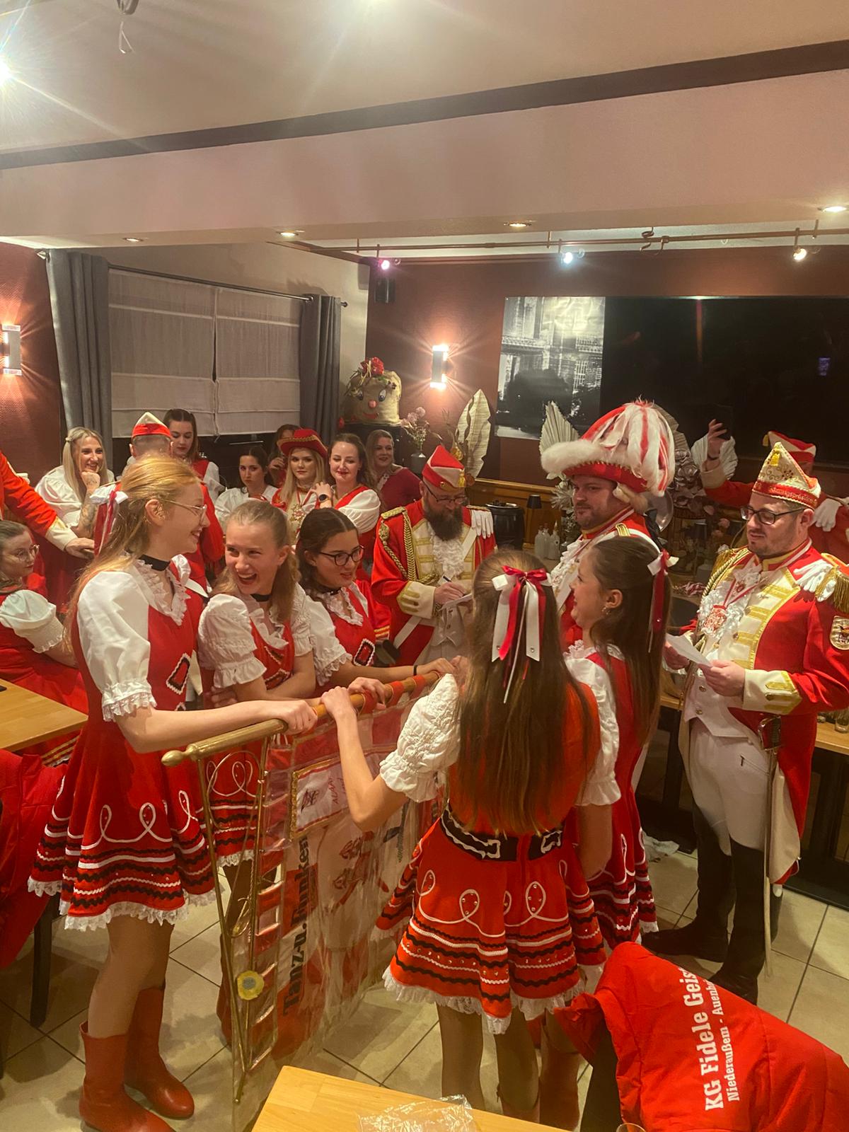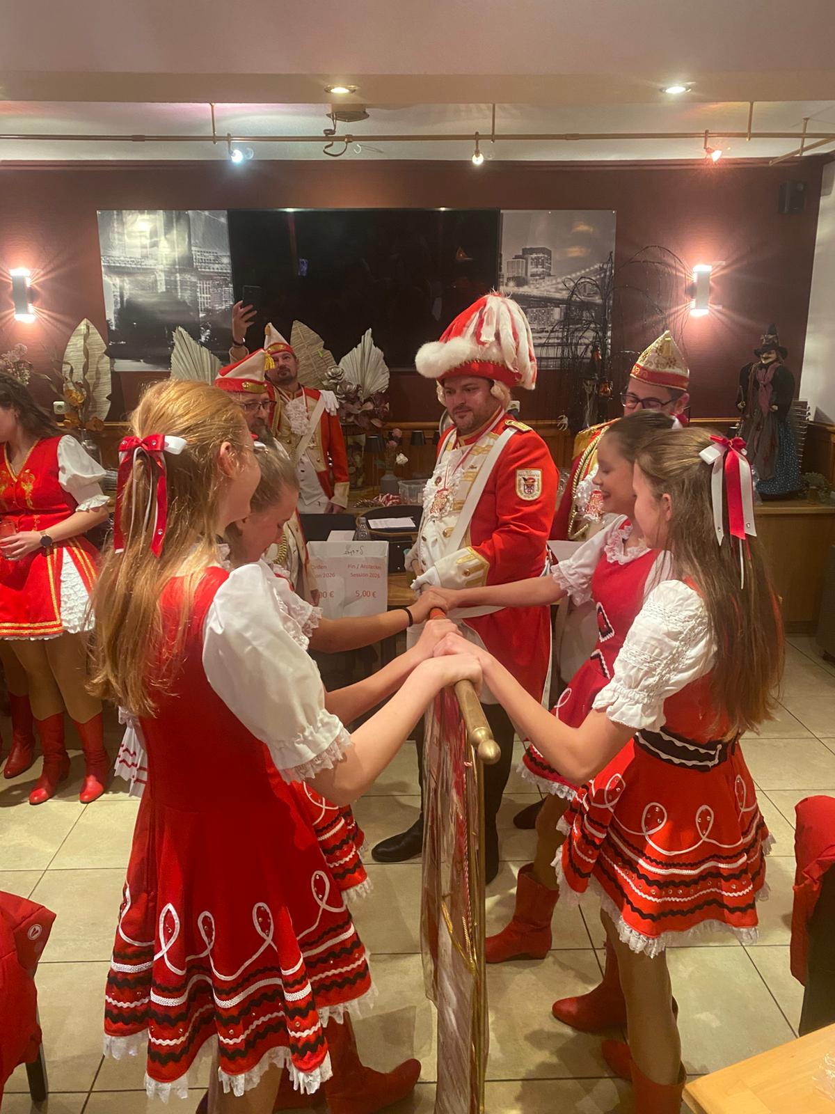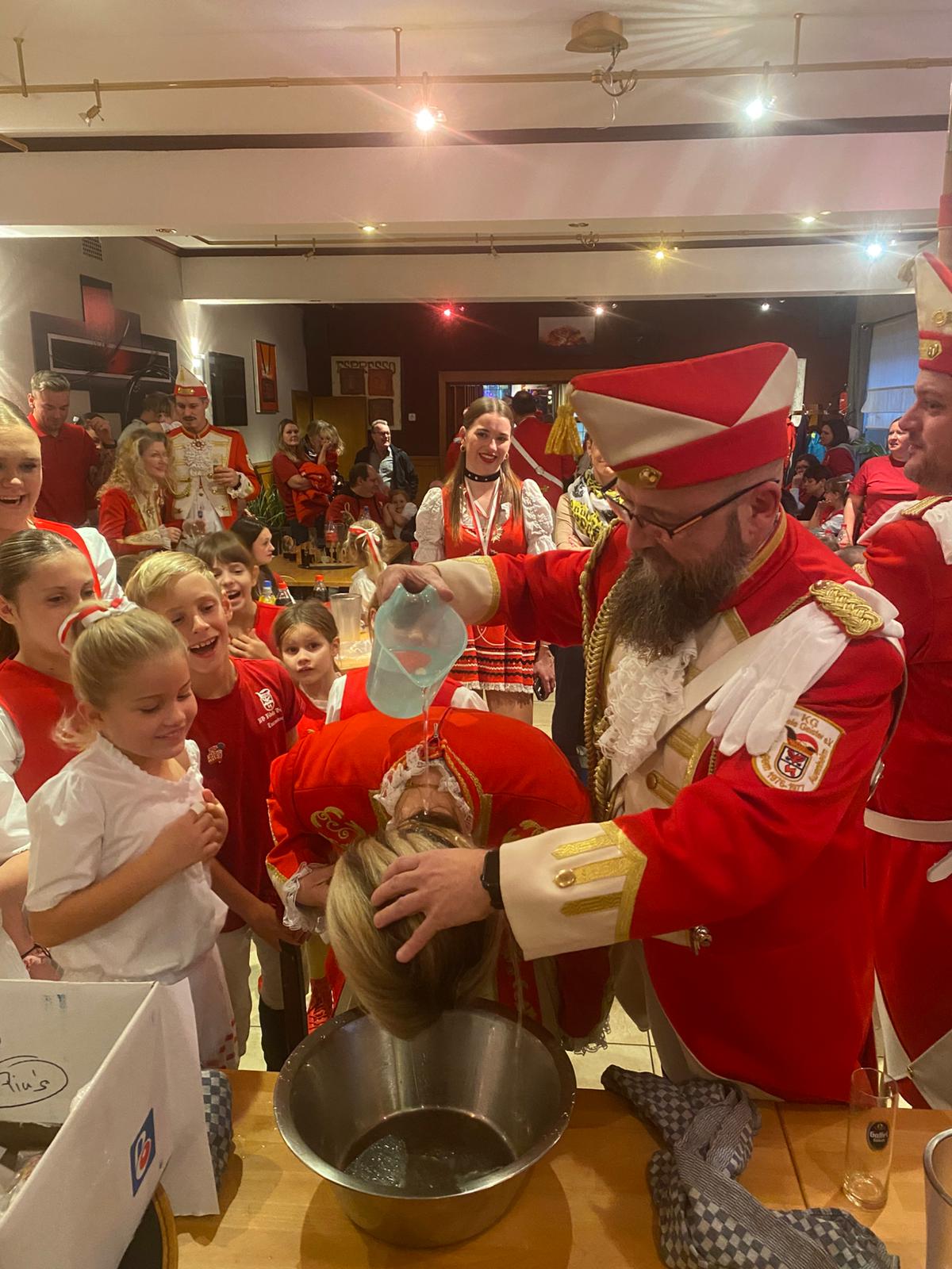 Für neue Mitglieder ist dieser Tag allerdings ein ganz besonderer. Wenn man nämlich eine Session erfolgreich hinter sich gebracht hat, wird man an diesem Tag getauft und feierlich in die Funken und Tanzgarde aufgenommen. Das war für mich dieses Jahr der Fall. Alles begann um 16 Uhr in unserer Funkenburg „Haus Decker“. Zunächst wurden die Tanzmäuse abgenommen. Nachdem alle Uniformen überprüft wurden, stand die Taufe der neuen Tanzmäuse auf dem Programm. Sie waren sichtlich stolz, nun auch ganz offiziell Teil der Garde zu sein. Danach folgte die Abnahme der Uniformen unserer Erfttöchter, der Regimentstöchter und zum Schluss von uns Rheintöchtern. Nun waren die restlichen Taufen in der gleichen Rheinfolge dran. Wir Rheintöchter wurden zuletzt getauft. Dafür stellten sich alle neuen Rheintöchter an der Fahne auf. Unser Kommandant Dennis präsentierte uns den nötigen Text, in dem wir dem Verein die Treue schwören, welchen wir nachsprachen. Nach unserem Versprechen folgte dann die Biertaufe. Dies übernahm unser 1. Vorsitzender Thorsten. Er hatte große Freude daran uns mit der Taufe offiziell im Verein aufzunehmen. Am Ende standen wir mit durchgenässten Haaren aber glücklich beieinander und feierten den Rest des Abends unsere Aufnahme.