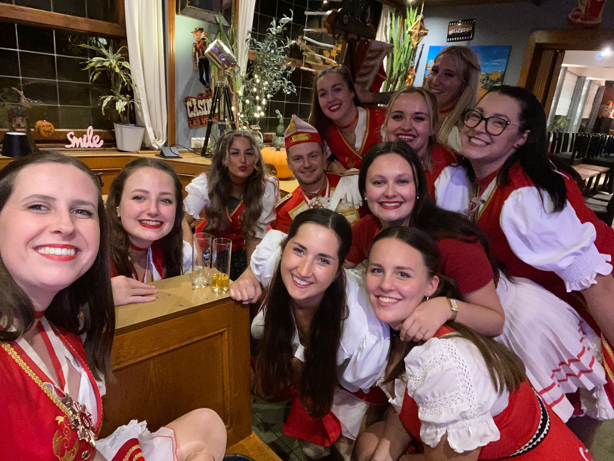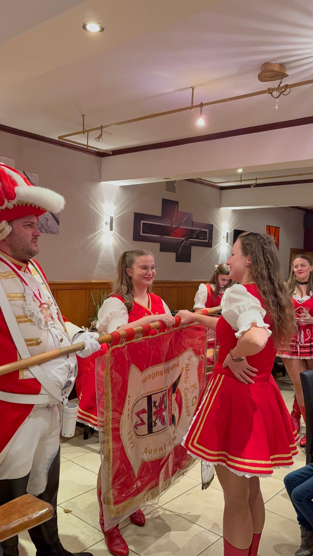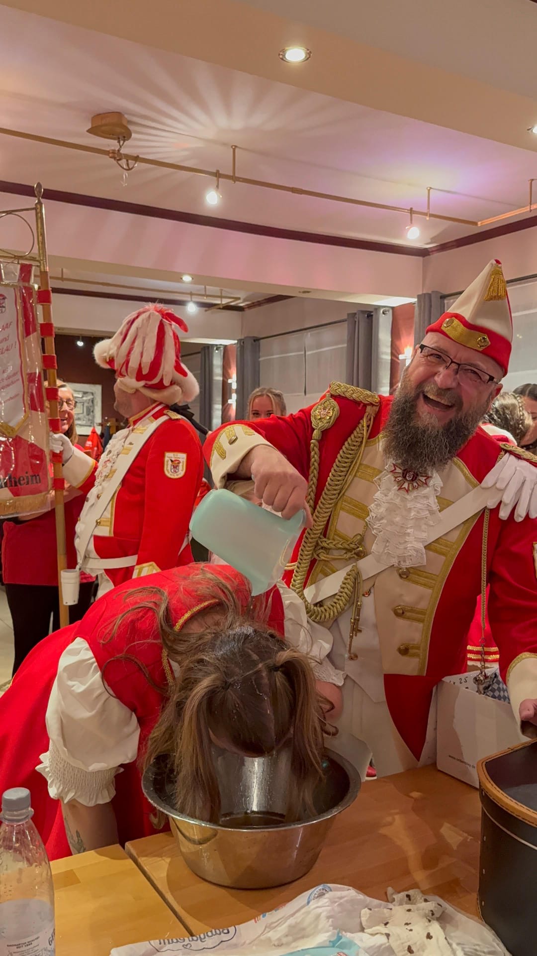 Für neue Mitglieder ist dieser Tag allerdings ein ganz besonderer. Wenn man nämlich eine Session erfolgreich hinter sich gebracht hat, wird man an diesem Tag getauft und feierlich in die Funken und Tanzgarde aufgenommen. Das war für mich dieses Jahr der Fall. Alles begann um 16 Uhr in unserer Funkenburg „Haus Decker“. Zunächst wurden die Tanzmäuse abgenommen. Nachdem alle Uniformen überprüft wurden, stand die Taufe der neuen Tanzmäuse auf dem Programm. Sie waren sichtlich stolz, nun auch ganz offiziell Teil der Garde zu sein. Danach folgte die Abnahme der Uniformen unserer Erfttöchter, der Regimentstöchter und zum Schluss von uns Rheintöchtern. Nun waren die restlichen Taufen in der gleichen Rheinfolge dran. Wir Rheintöchter wurden zuletzt getauft. Dafür stellten sich alle neuen Rheintöchter an der Fahne auf. Unser Kommandant Dennis präsentierte uns den nötigen Text, in dem wir dem Verein die Treue schwören, welchen wir nachsprachen. Nach unserem Versprechen folgte dann die Biertaufe. Dies übernahm unser 1. Vorsitzender Thorsten. Er hatte große Freude daran uns mit der Taufe offiziell im Verein aufzunehmen. Am Ende standen wir mit durchgenässten Haaren aber glücklich beieinander und feierten den Rest des Abends unsere Aufnahme.